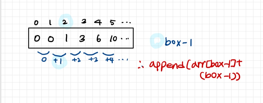 arr = [0] #index์ box์ ์ธต์๋ฅผ ๋ง์ถ๊ธฐ ์ํด 0๋ฒ index์ 0์ ๋ฃ์ด arr ์ด๊ธฐํ