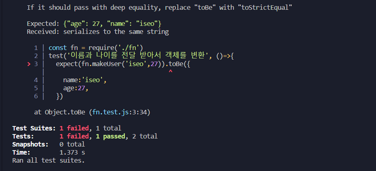 expect(fn.makeUser('iseo',27)).toEqual({