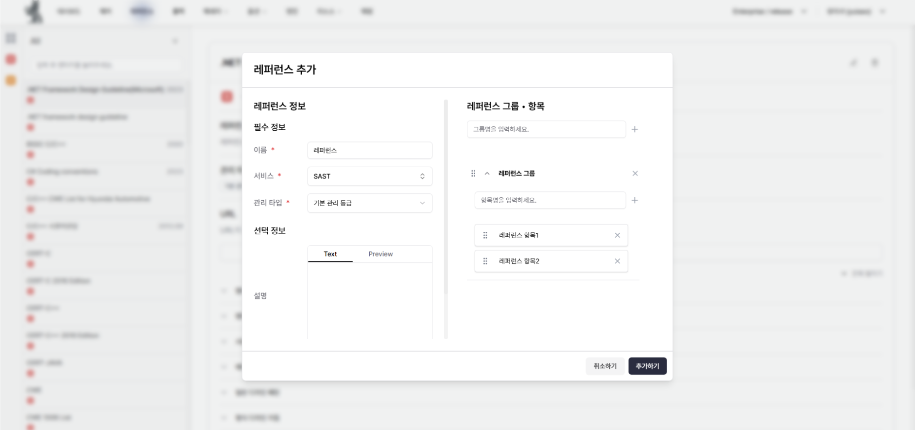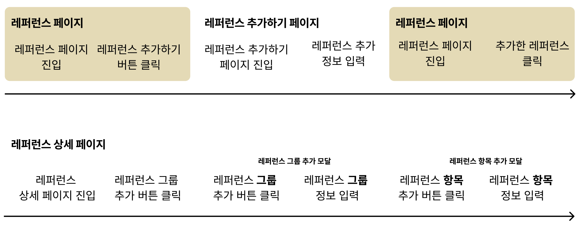 1. ๋ ํผ๋ฐ์ค ์ถ๊ฐํ๊ธฐ ํ์ด์ง๊ฐ ๋ฐ๋ก ์๊ณ , ๋ ํผ๋ฐ์ค ๊ทธ๋ฃน, ๋ ํผ๋ฐ์ค ํญ๋ชฉ์ ์ถ๊ฐ์ ๋ํ ๊ฒ๋ค๋ ๊ฐ๊ฐ ์กด์ฌํจ
