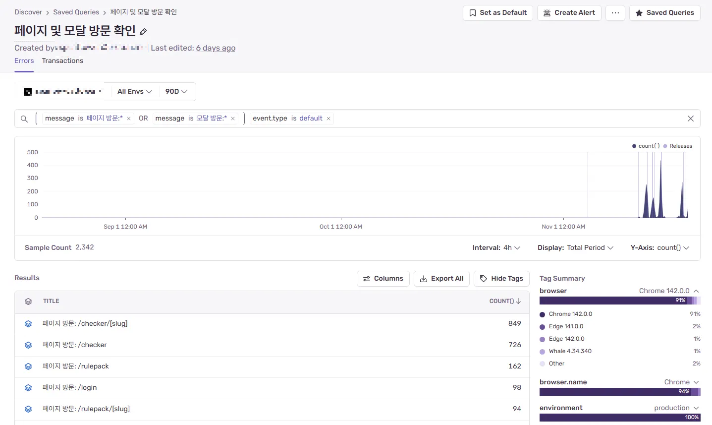 (message:"ํ์ด์ง ๋ฐฉ๋ฌธ:*" OR message:"๋ชจ๋ฌ ๋ฐฉ๋ฌธ:*") event.type:default(message:"ํ์ด์ง ๋ฐฉ๋ฌธ:*" OR message:"๋ชจ๋ฌ ๋ฐฉ๋ฌธ:*") event.type:default