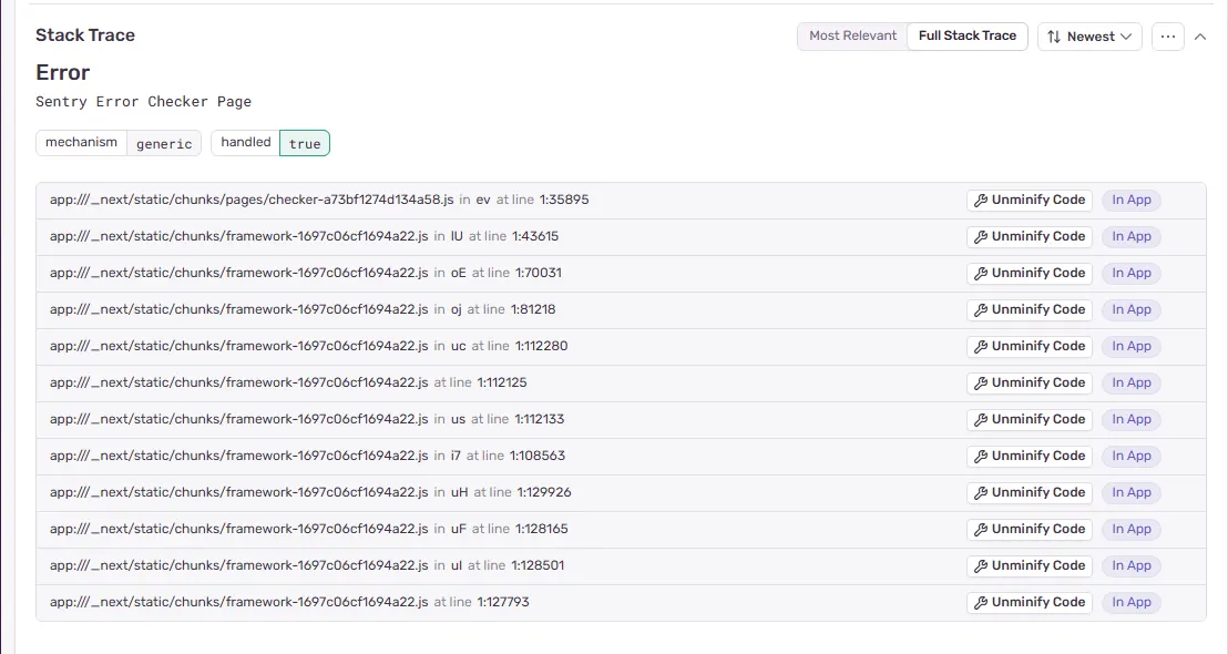 ํ๋ก ํธ์๋ ์ฝ๋๋ ๋น๋ ๊ณผ์ ์์ ๋ฒ๋ค๋ง/์์ถ์ด ์ด๋ฃจ์ด์ง๊ธฐ ๋๋ฌธ์, Sentry์ ๋ฐ๋ก ์ฐ๋ํ๋ฉด ์คํ ํธ๋ ์ด์ค์ ๋๋ต ๋ค์๊ณผ ๊ฐ์ด ํ์๋๋ค.