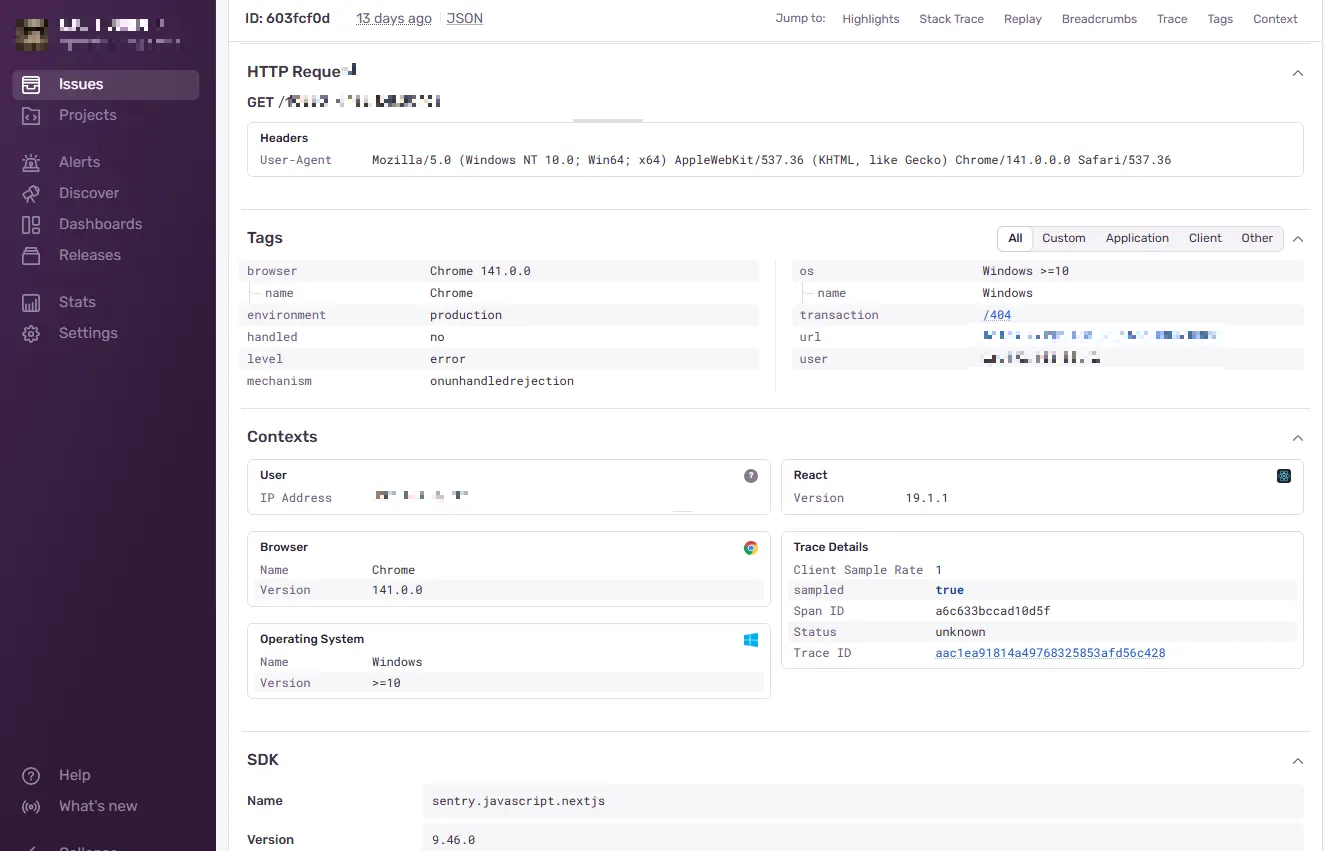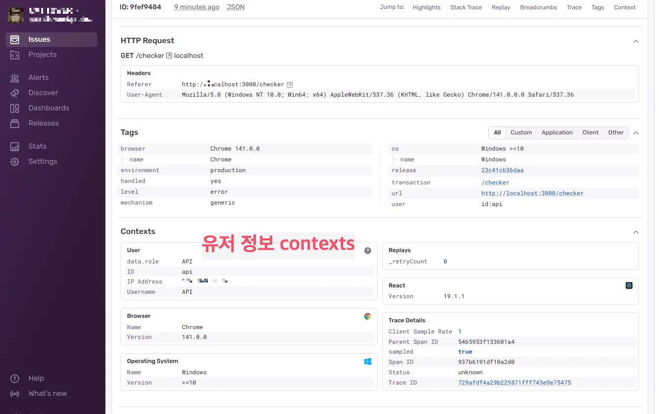 ์ด์ ๊ธ ์์ sentry๋ฅผ ํ๋ก ํธ์๋ ์๋ฒ์ ์ฐ๋ ์๋ฃํ์๋ค. ํ์ง๋ง ์ด๋ค ์ ์ ๊ฐ ๋ฐ์ํ ์ค๋ฅ์ธ์ง ํ์ธํ๊ธฐ๋ ์ด๋ ค์ ๊ณ ์์ค๋งต ์ฐ๋๋ ์ ๋๋ก ๋์ด์์ง ์์์ ์ด๋ค ์ฝ๋์์ ๋ฐ์ํ ์๋ฌ์ธ์ง ํ ๋์ ์์๋ณผ ์ ์๋ ์ํฉ์ ์ค๋ฅ๋ฅผ ํธ๋ ์ด์คํ๊ธฐ ์ด๋ ค์ด ๋ฌธ์ ์ ์ ๊ฐ์ง๊ณ ์์๋ค.