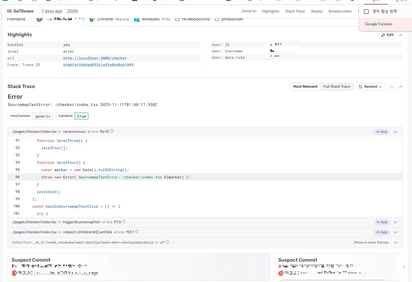 ์ด ํ์ด์ง์์ ์ฌ์ฉ๋ ์ด๋ค React ์ปดํฌ๋ํธ์์ ๋ฌธ์ ๊ฐ ํฐ์ง ๊ฑด์ง, ๊ทธ ์ปดํฌ๋ํธ๊ฐ ์ด๋ค ๋ถ๋ชจ ์ปดํฌ๋ํธ ํธ๋ฆฌ ์์ ์์๋์ง ์ถ์ ํ๋ ๊ฒ๋ sentry์์ ๊ธฐ๋ฅ์ ์ ๊ณตํ๋ค.