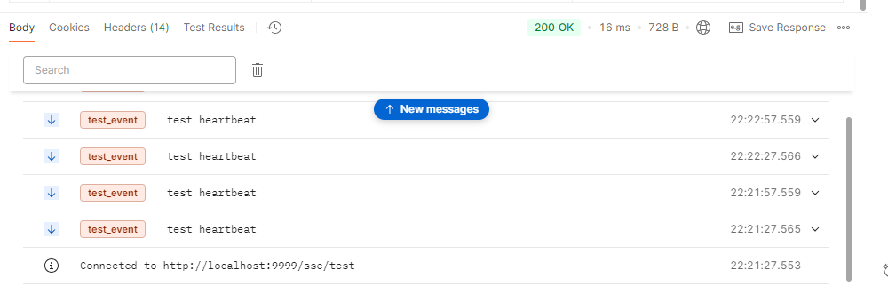 ๋ฐ๋ก ๋ฐฑ์๋ ์๋ฒ์ ์์ฒญํ์ ๋์๋ ์ฐ๊ฒฐ์ด ๋์๋ง์ ๋ฉ์์ง๊ฐ ์ค๊ณ , ์ดํ ์ฐ๊ฒฐ์ ์ ์งํ๋ ๋ฉ์์ง๋ ์จ๋ค. ์ฆ SSE๊ฐ ๋ฉ์์ง๋ฅผ ๋ณด๋ผ ๋๋ง๋ค ์๋ต์ด ๋์ฐฉํ๋ค.