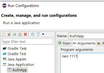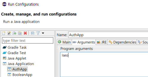 ์ฒ์์ Run Configurations์ ๋ค์ด๊ฐ Argument์ ๊ฐ์ ์ง์ ํด ์ค๋ค. ๋์ ๊ฒฝ์ฐ Iseo๋ฅผ ๋ฑ๋ก!